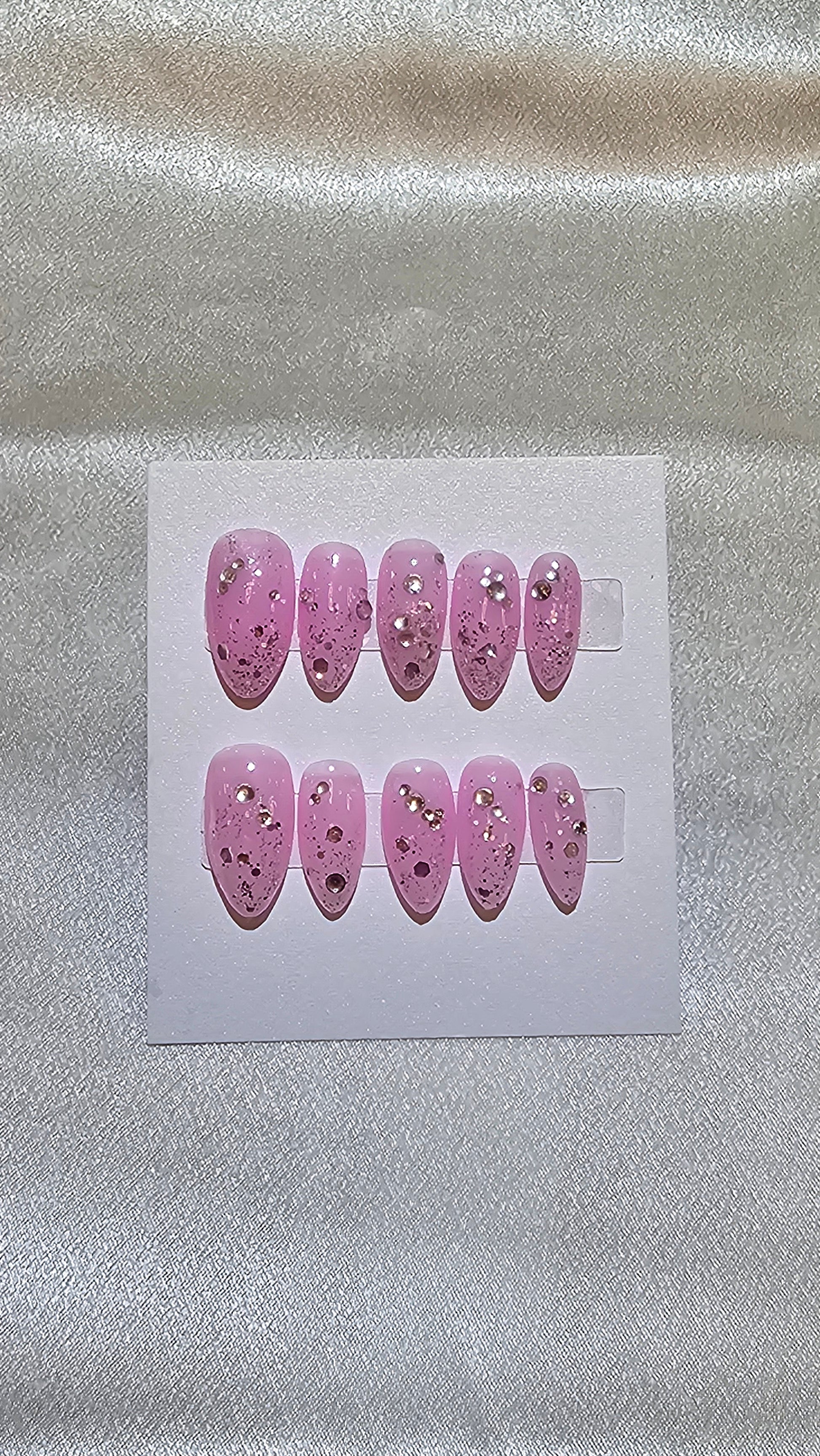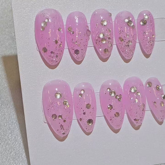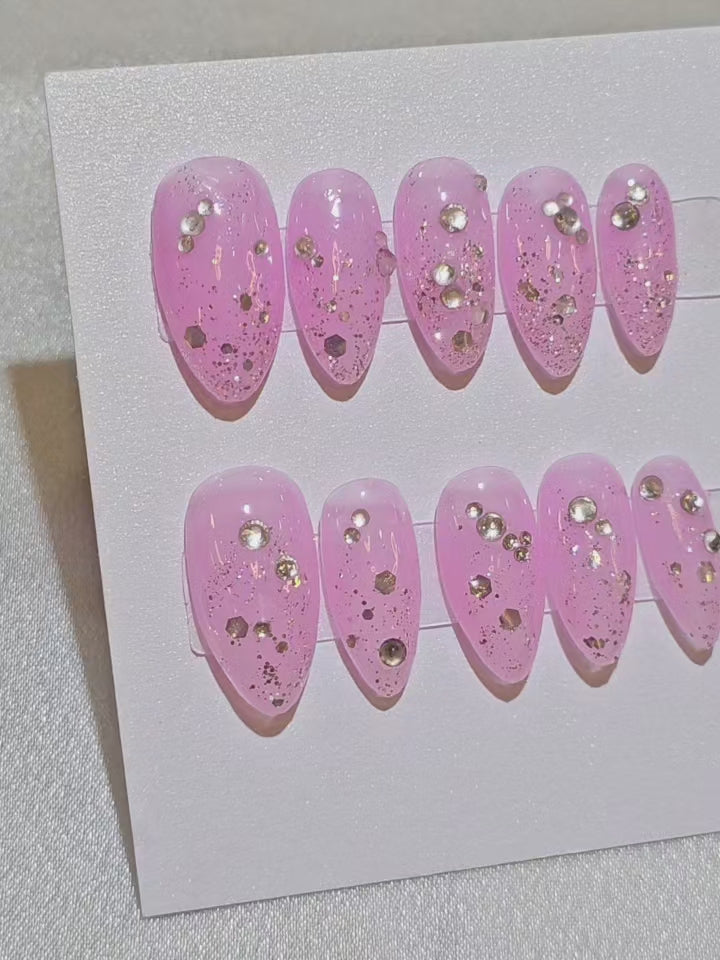 feature a dreamy pastel pink base dusted with fine glitter and flecked with silver-like accents for a sparkling galaxy effect. Scattered rhinestones add dimension and catch the light beautifully, giving the set a luxe, whimsical vibe.🌸✨️